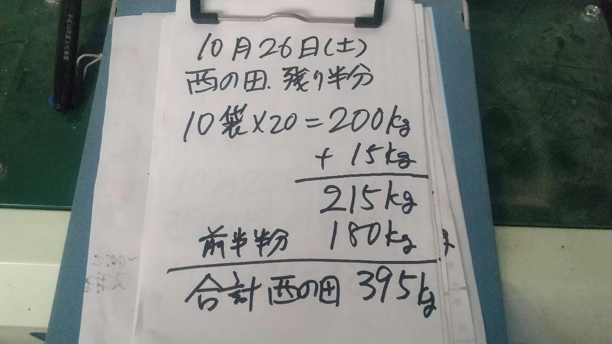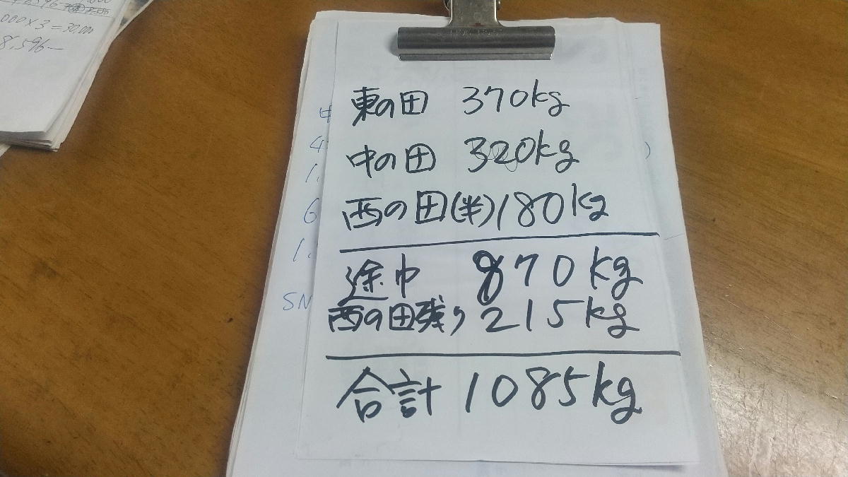結局、西の田では、合わせて9畝で395キロ取れました。