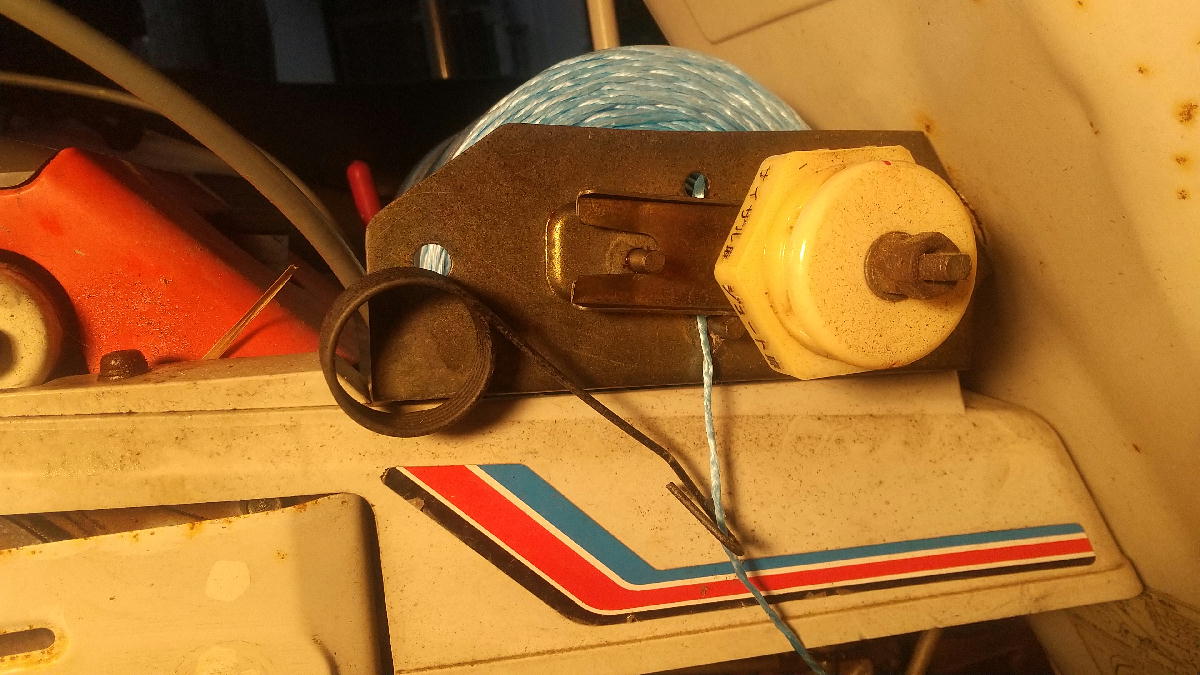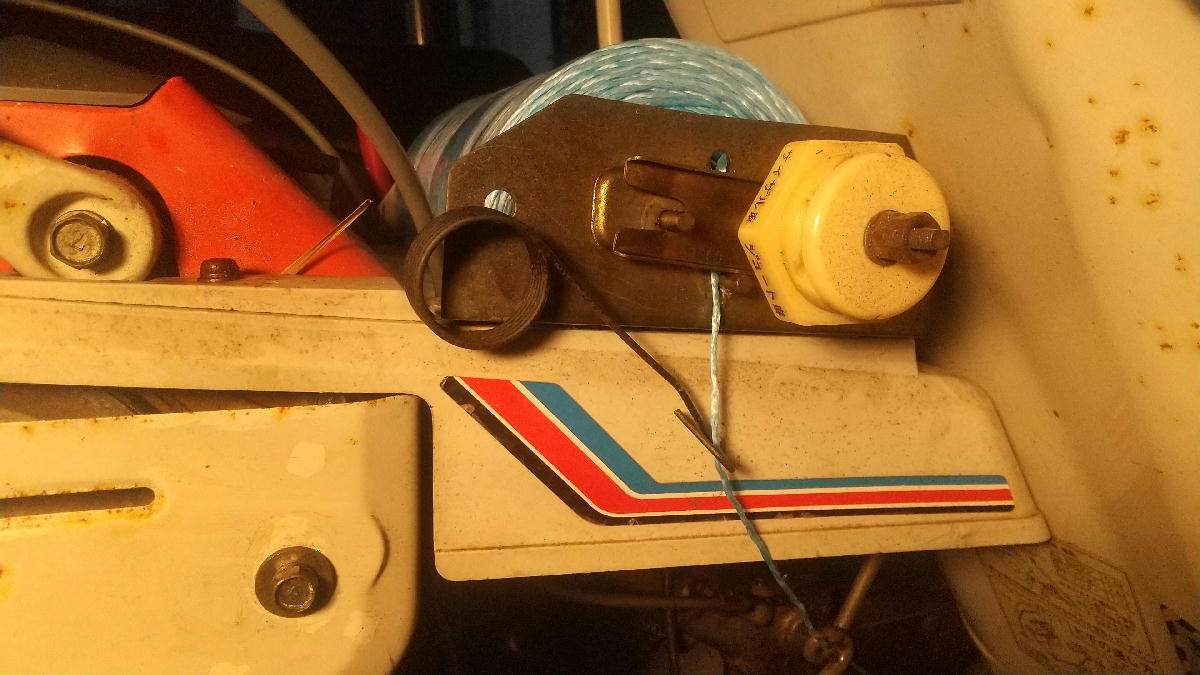説明図を見ると、ヒモブレーキから出たヒモが、ユルミトリというバネの輪を通って行くのですが、そのバネが左右反対の所に付いていました。