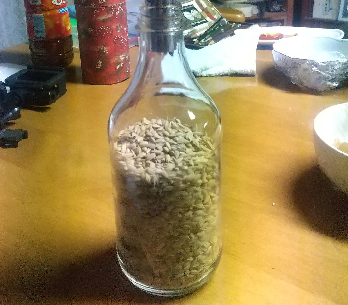 今日は、ビンの中にモミを入れてモミすりしてみました。