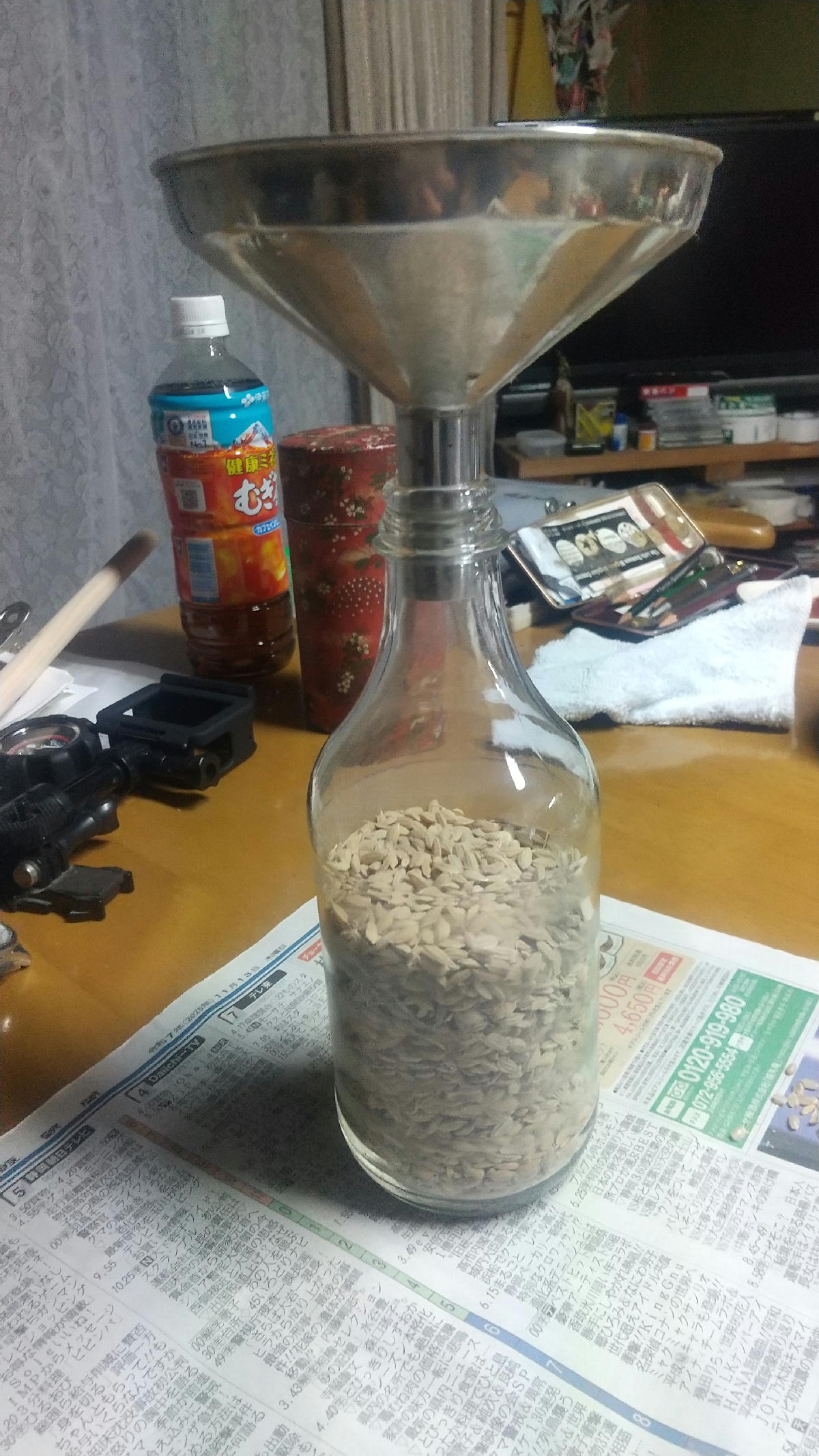 漏斗を使ってモミを入れました。