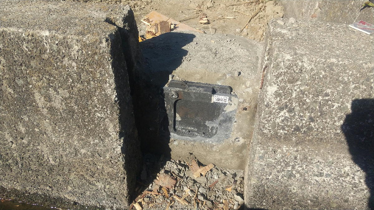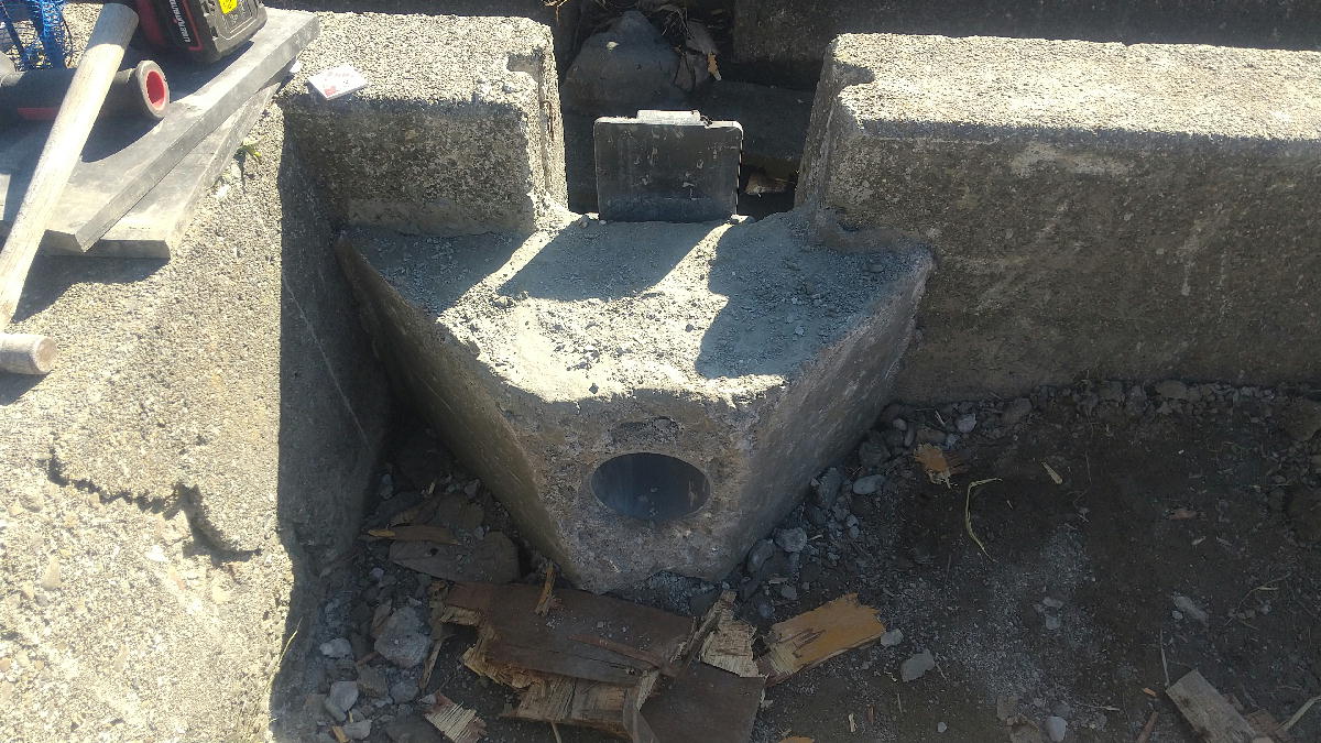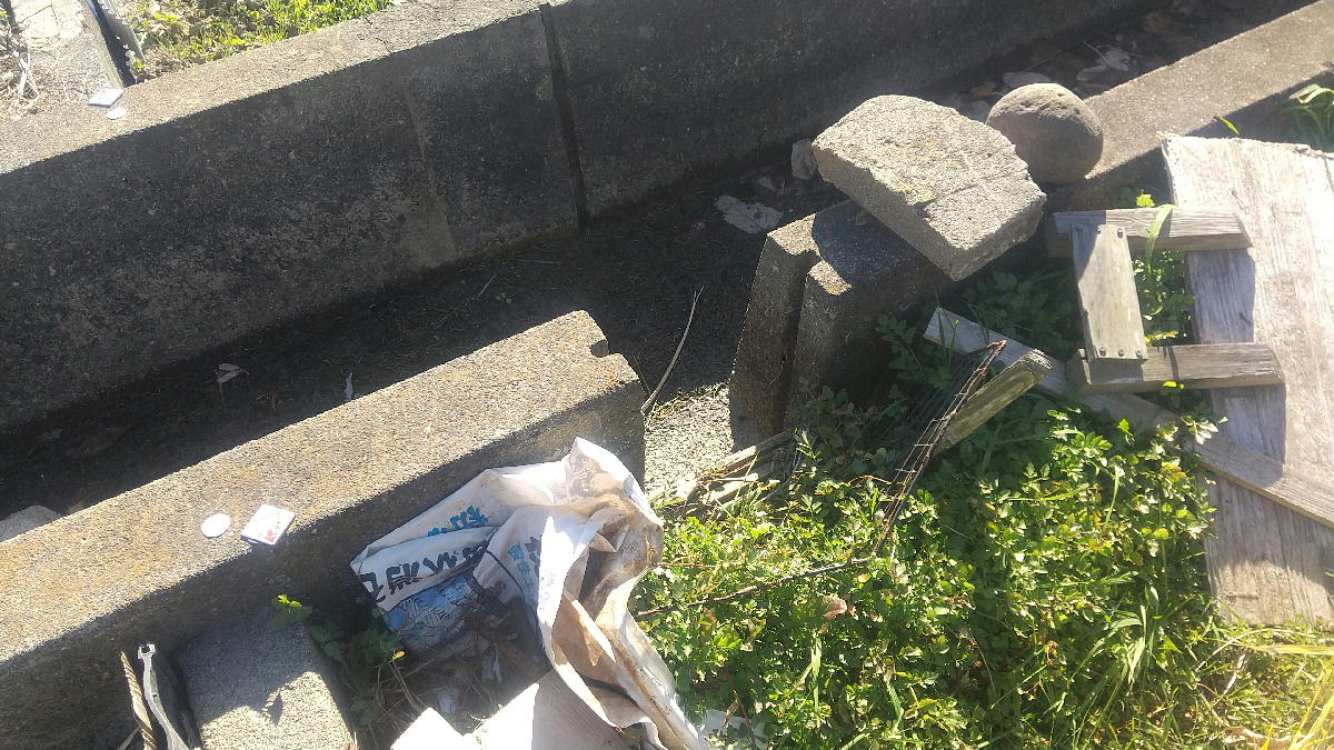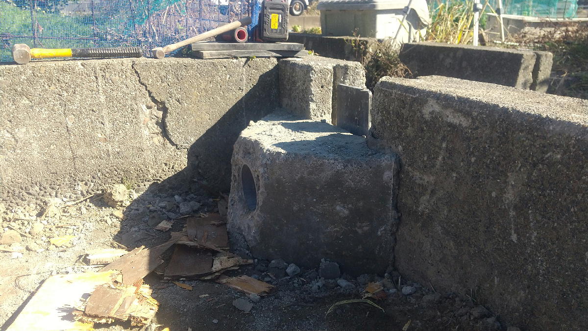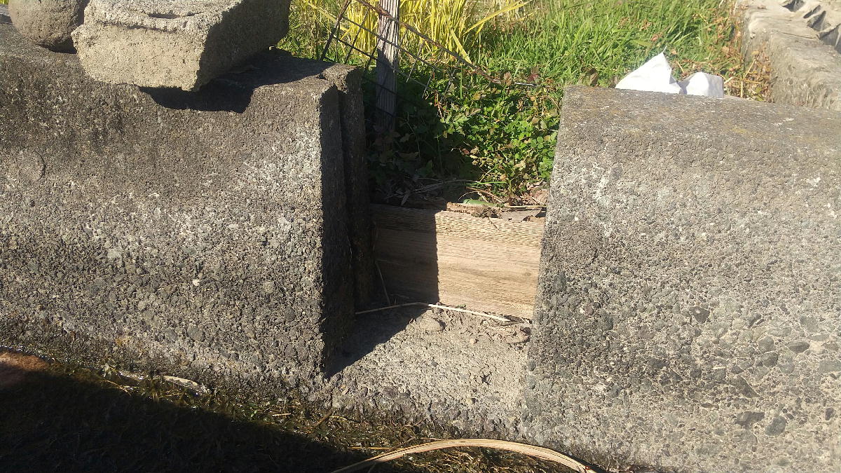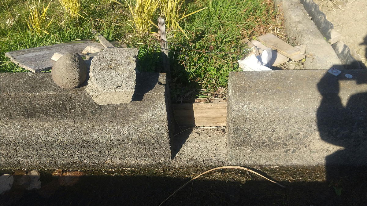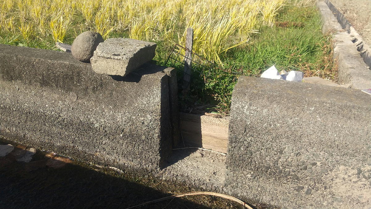 ブロックと板などで水を堰き止めて田んぼに入れます。