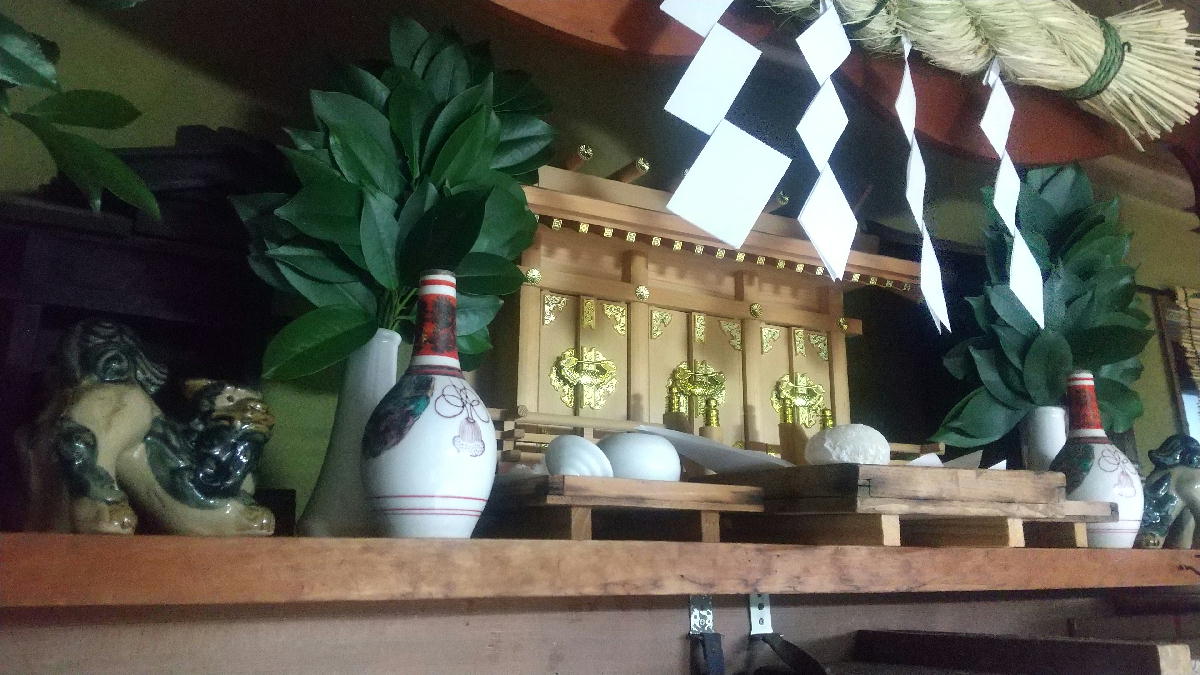 神棚に、お餅と、御神酒と、お雑煮と、いつもの米塩水を上げました。